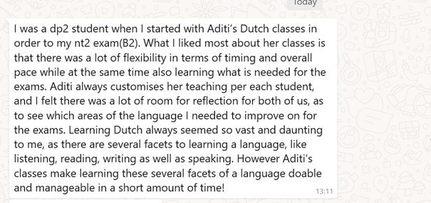 "I am very much happy to tell everyone that I had a great time while learning Dutch with u.. U are such a friendly, adjustable and a lovely teacher.. Wish u all the very best and Thanks a lot for helping me clearing my A2 exams as well..”